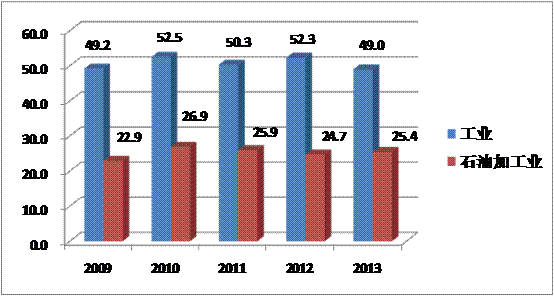 圖1:2009—2013年工業(yè)、石油加工企業(yè)物流外包比情況 單位:%