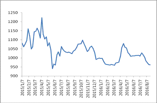圖 1 2015-2016年各周中國公路物流運價指數