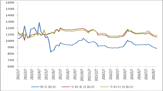 各車型指數漲跌不一,其中整車指數、零擔重貨指數環比回落,零擔輕貨指數環比回升。本周,整車指數為885.5點,環比回落0.3%,比上年同期下降4.9%;零擔重貨指數為1064.7點,環比回落0.2%,比上年同期下降9.1%;零擔輕貨指數為1090.6點,環比回升0.4%,但比上年同期下降5.1%。