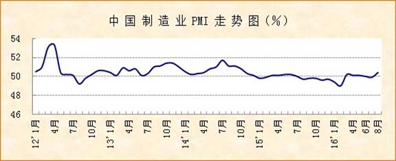 中國物流與采購聯合會、國家統(tǒng)計局服務業(yè)調查中心發(fā)布的2016年8月份中國制造業(yè)采購經理指數(PMI)為50.4%,較上月上升0.5個百分點,為今年以來最為明顯的一次上升。主要分項指數普遍回升,達到去年同期水平以上。綜合來看,當前經濟運行積極變化明顯,市場供需雙雙回升,企業(yè)信心增強,預期向好,整體走勢向趨穩(wěn)方向發(fā)展。