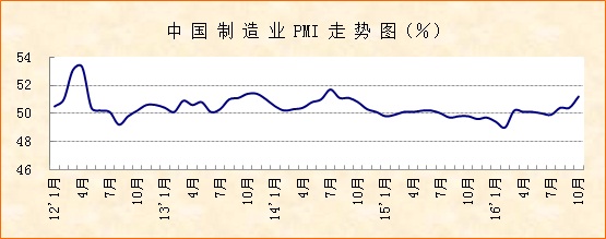 中國物流與采購聯合會、國家統計局服務業調查中心發布的2016年10月份中國制造業采購經理指數(PMI)為51.2%,較上月上升0.8個百分點,自2014年10月份以來首次回升到51%以上。主要分項指數普遍回升,高于去年同期1個百分點以上。綜合來看,PMI指數回升特點明顯,回升幅度較大,回升覆蓋面較廣,顯示當前經濟走勢穩中有升。