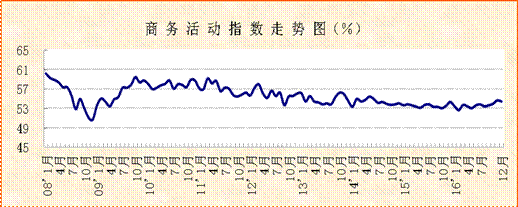 中國物流與采購聯合會、國家統計局服務業調查中心發布的2016年12月份中國非制造業商務活動指數達到54.5%,雖較上月小幅回調,但仍然連續三個月運行在54%以上的較高水平。從2016年全年來看,非制造業商務活動指數呈現逐季回升走勢。前三季度穩中有升,保持在53%以上的水平,四季度升幅有所擴大,較三季度上升0.7個百分點,均值達到54.4%,反映出非制造業經濟活動延續穩健向好的運行趨勢。