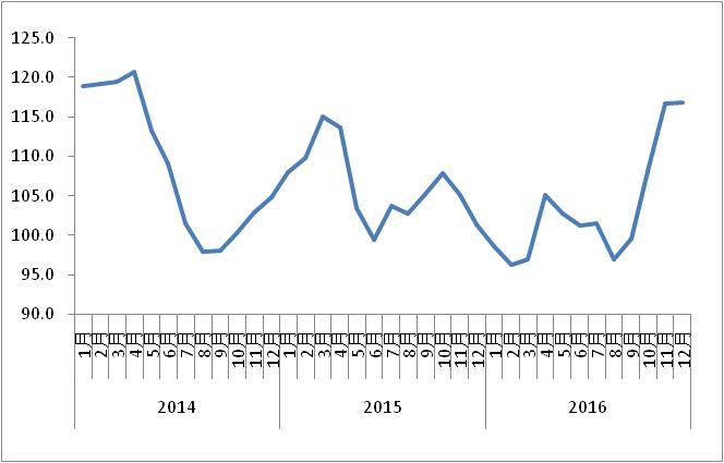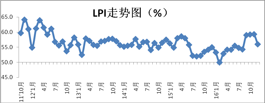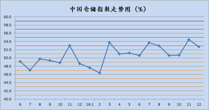 中國物流與采購聯合會發布的2016年12月份中國物流業景氣指數為56%較上月回落3.3個百分點;中國倉儲指數為52.7%,較上月回落1.8個百分點;中國公路物流運價指數為116.8點,比上月回升0.06%。