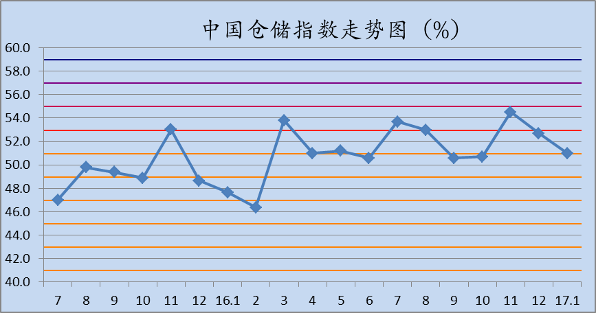 中國物流與采購聯(lián)合會與中儲發(fā)展股份有限公司聯(lián)合調(diào)查的2017年1月中國倉儲指數(shù)為51.0%,較上月回落1.7個百分點,連續(xù)十一個月位于擴(kuò)張區(qū)間。各分項指數(shù)中,除新訂單指數(shù)、延伸業(yè)務(wù)量指數(shù)、設(shè)施利用率指數(shù)、企業(yè)員工指數(shù)及業(yè)務(wù)活動預(yù)期指數(shù)較上月有所回升外,其余指數(shù)均有不同程度的回落。