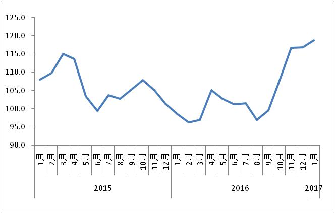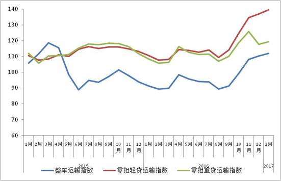 由中國物流與采購聯(lián)合會和林安物流集團聯(lián)合調(diào)查的中國公路物流運價指數(shù)2017年1月為118.8點,比上月回升1.7%,運價指數(shù)連續(xù)五個月環(huán)比回升,月內(nèi)各周指數(shù)環(huán)比也均有所回升。