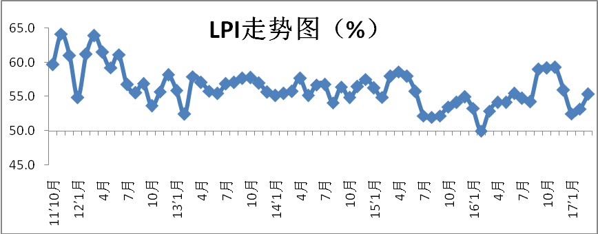 中國物流與采購聯合會發布的2017年3月份中國物流業景氣指數為55.4%較上月回升2.2個百分點;中國倉儲指數為54.5%,較上月回升0.5個百分點;中國公路物流運價指數為107.8點,比上月回落1.8%。