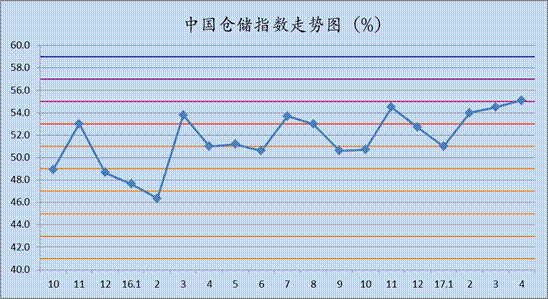 中國(guó)物流與采購(gòu)聯(lián)合會(huì)與中儲(chǔ)發(fā)展股份有限公司聯(lián)合調(diào)查的2017年4月中國(guó)倉(cāng)儲(chǔ)指數(shù)為55.1%,較上月回升0.6個(gè)百分點(diǎn),連續(xù)十四個(gè)月位于擴(kuò)張區(qū)間。各分項(xiàng)指數(shù)中,設(shè)施利用率指數(shù)、收費(fèi)價(jià)格指數(shù)、主營(yíng)業(yè)務(wù)成本指數(shù)、期末庫(kù)存指數(shù)及企業(yè)員工指數(shù)較上月有所回升,其余指數(shù)均有不同程度的回落。