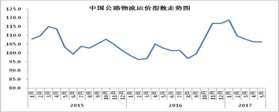 中國(guó)物流與采購(gòu)聯(lián)合會(huì)發(fā)布的2017年5月份中國(guó)物流業(yè)景氣指數(shù)為57.7%較上月回落0.5個(gè)百分點(diǎn);中國(guó)倉(cāng)儲(chǔ)指數(shù)為52.4%,較上月回落2.7個(gè)百分點(diǎn);中國(guó)公路物流運(yùn)價(jià)指數(shù)為106.33點(diǎn),比上月回升0.07%;中國(guó)電商物流運(yùn)行指數(shù)同比指數(shù)為121點(diǎn),比上月小幅回落0.1點(diǎn)。