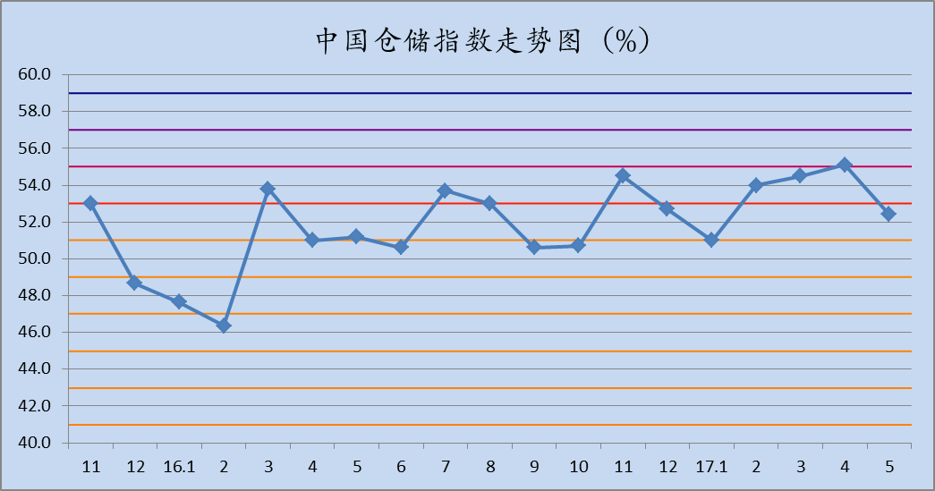 中國物流與采購聯合會與中儲發展股份有限公司聯合調查的2017年5月中國倉儲指數為52.4%,較上月回落2.7個百分點,連續十五個月位于擴張區間。各分項指數中,延伸業務量指數與上月持平,業務量指數、收費價格指數、業務利潤指數較上月有所回升,其余指數均有不同程度的回落。