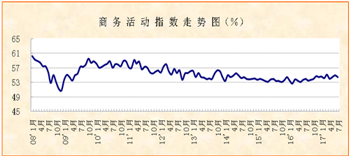 中國物流與采購聯合會、國家統計局服務業調查中心發布的2017年7月份中國非制造業商務活動指數環比小幅回落,但整體波動幅度不大,連續十個月保持在54%以上;新訂單指數連續兩個月穩定在51%以上;銷售價格指數連續兩個月環比上升,本月升至50%以上;從業人員指數小幅回落0.1個百分點,連續六個月穩定在49%以上;業務活動預期指數持平,指數保持在61%以上的高位。市場供需、價格和就業的持續性變化反映非制造業持續較快發展的勢頭未變。