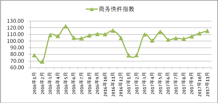 商務(wù)活動保持活躍態(tài)勢。11月份商務(wù)快件指數(shù)為115.3%,比上月回升3.6個百分點(diǎn),不僅連續(xù)3個月回升,升幅也比較明顯,其中11月份制造業(yè)商務(wù)快件指數(shù)為115.3%,比上月回升3.8個百分點(diǎn),服務(wù)業(yè)商務(wù)快件指數(shù)為115.3%,比上月回升3.5個百分點(diǎn)。跨境進(jìn)口來看,11月份跨境快件指數(shù)為119%,比上月回升4.6個百分點(diǎn),11月份跨境快件同比增長21%,今年以來跨境快件同比增長25%。