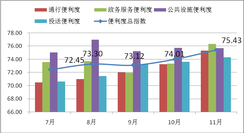外部環(huán)境整體趨好。11月份,便利度指數(shù)為75.4%,比上月回升1.4個百分點(diǎn),其中通行和政務(wù)服務(wù)明顯改善。從分項來看,通行便利度指數(shù)為75.3%,比上月提高2.1個百分點(diǎn),政務(wù)服務(wù)便利度指數(shù)為76.4%,比上月提高3個百分點(diǎn),公共設(shè)施便利度指數(shù)為75.7%,比上月下降0.1個百分點(diǎn),投送便利度指數(shù)為74.3%,比上月提高0.7個百分點(diǎn)。
