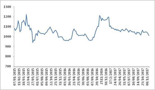 圖 1 2015-2017年各周中國公路物流運(yùn)價(jià)指數(shù)