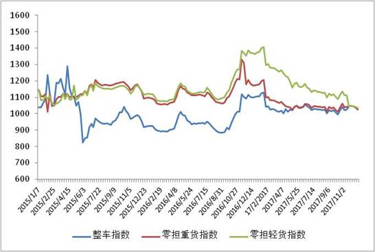 本周(2017年12月25日~12月29日),由中國物流與采購聯(lián)合會和林安物流集團(tuán)聯(lián)合調(diào)查的中國公路物流運(yùn)價(jià)指數(shù)1012.35點(diǎn),環(huán)比回落1.63%。