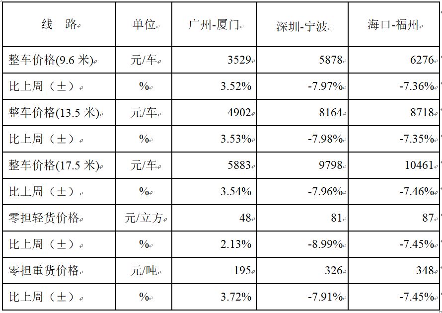 表1 本周部分線路平均價(jià)格及環(huán)比情況對(duì)比