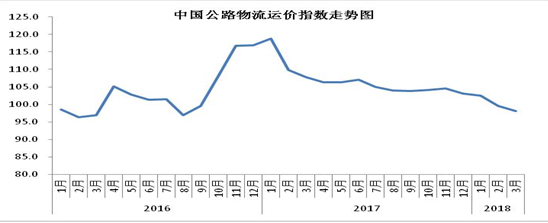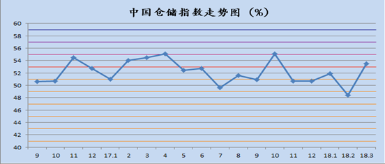 中國物流與采購聯合會發布的2018年3月份中國物流業景氣指數為53.4%,較上月回升3.4個百分點;中國倉儲指數為53.5%,較上月回升5.1個百分點;中國公路物流運價指數為98.0點,比上月回落1.5%。