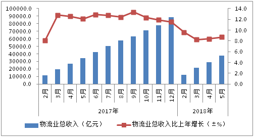 進入5月,物流市場環境和供需連續回升,物流業收入規模保持增勢,且增長較前期有所加快。1-5月物流業總收入為3.7萬億元,同比增長8.7%,增速比1-4月提高0.3個百分點。