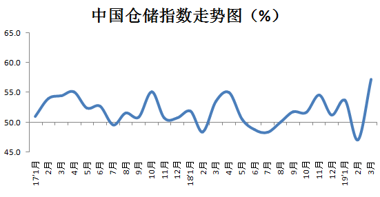 中國物流與采購聯合會發布的2019年3月份中國物流業景氣指數為52.6%,較上月回升3個百分點;中國倉儲指數為57.2%,較上月回升10.1個百分點。