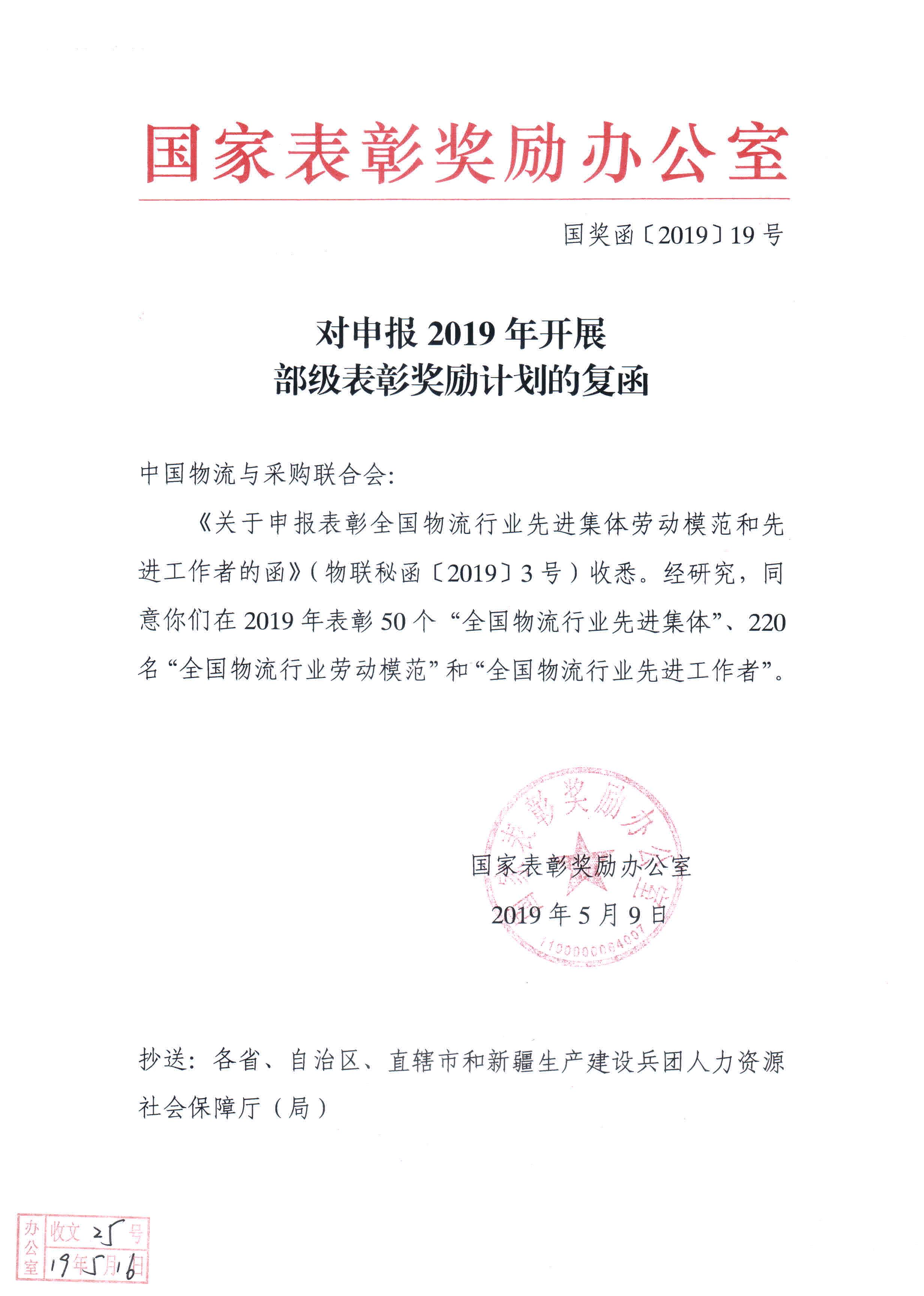 近日,國家表彰獎(jiǎng)勵(lì)辦公室復(fù)函中國物流與采購聯(lián)合會,同意在2019年表彰50個(gè)“全國物流行業(yè)先進(jìn)集體”、220名“全國物流行業(yè)勞動模范”和“全國物流行業(yè)先進(jìn)工作者”。
