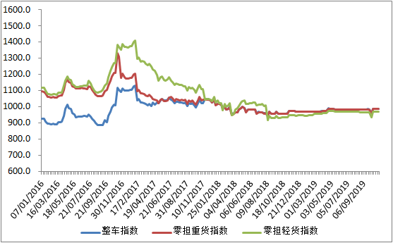 分車型看,各車型指數環比均有不同程度回落。其中,整車指數為987.00點,比上周回落0.04%;零擔重貨指數為986.24點,比上周回落0.04%;零擔輕貨指數為967.95點,比上周回落0.03%。