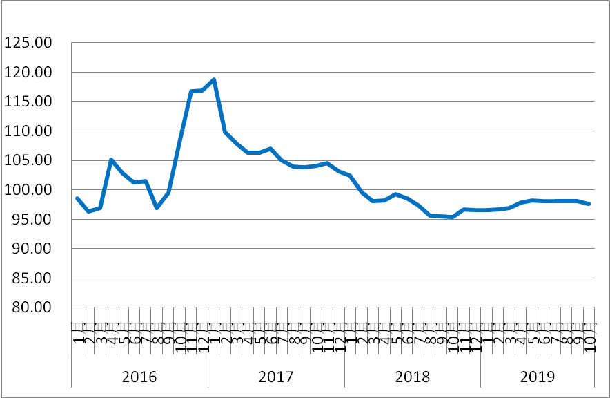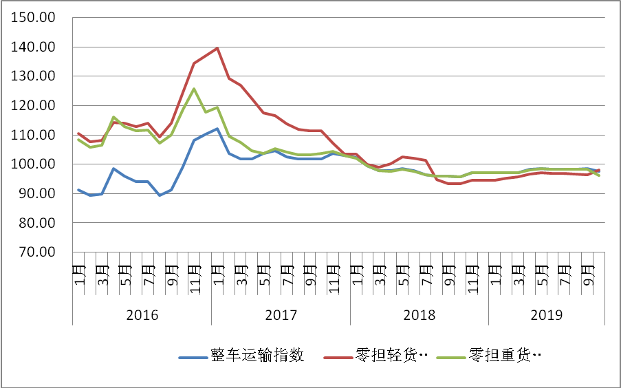 2019年10月份,由中國物流與采購聯(lián)合會和林安物流集團聯(lián)合調(diào)查的中國公路物流運價指數(shù)為97.7點,比上月回落0.38%,但仍比去年同期增長2.4%。月內(nèi)各周指數(shù)震蕩波動,漲跌互現(xiàn),其中月初、月末指數(shù)環(huán)比回落,第二、三、四周環(huán)比回升。