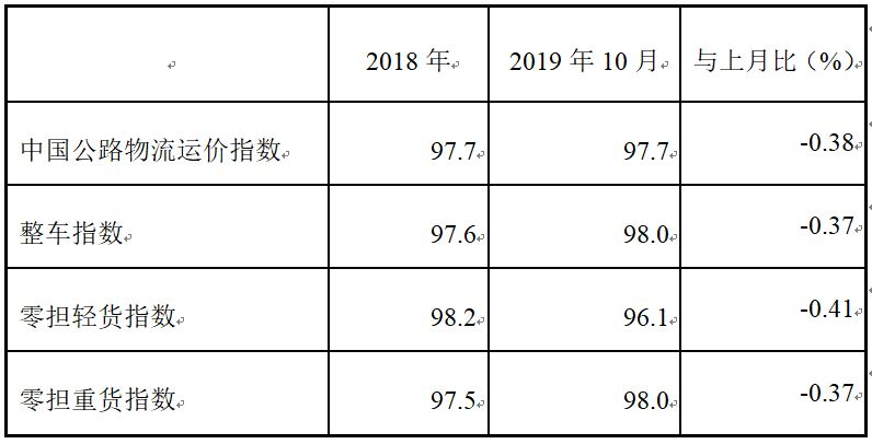 表1 2019年10月中國公路物流運價指數(shù)表