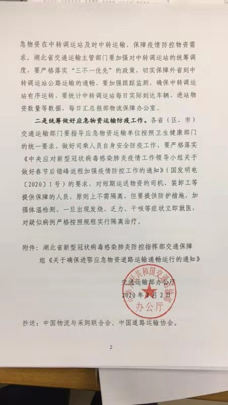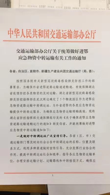 組《關(guān)于確保進(jìn)鄂應(yīng)急物資道路運(yùn)輸通暢運(yùn)行的通知》