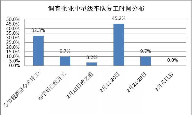 被調查企業中,85%的企業反映疫情對企業經營造成較大影響,其中反映影響較大的占50%,部分企業經營暫時停頓。還有7%的企業反映影響嚴重,可能出現破產倒閉風險。被調查企業中,2月10日后開工的占58%,但是據調研企業反映,企業復工復產形勢嚴峻,多地存在延期復工問題。星級車隊復工情況好于行業平均水平,有32.3%的車隊春節至今未停工停產。