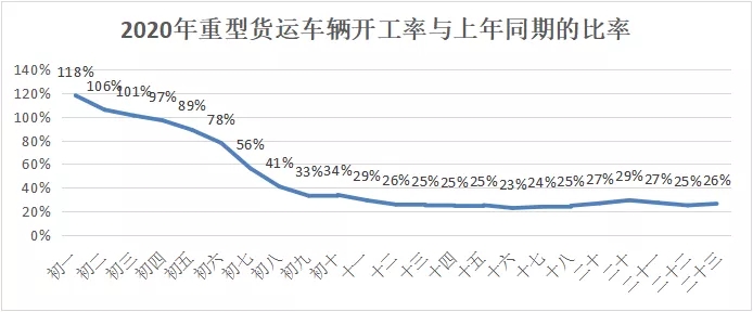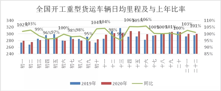 行業大數據顯示,行業車輛開工率大幅低于往年。據全國道路貨運車輛公共監管與服務平臺數據分析顯示,全國貨運車輛節后開工形勢不佳,正月十五(2月8日)全國12噸以上重型貨運車輛開工率僅為往年同期的四分之一。正月十七(2月10)以后,隨著企業加快復工復產,行業開工率小幅回升,接近往年的三成左右。開工車輛運行效率穩定,數據顯示,節后全國開工重型貨運車輛日均行駛里程與上年基本持平,反映已開工車輛運行效率基本穩定。
