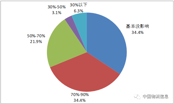 已復工企業倉庫利用率水平下降不大,總體情況較好,九成以上企業達到去年同期水平的50%以上。其中,34.4%的已復工企業反映與去年同期相比變化不大;34.4%的已復工企業反映達到去年同期水平的70%-90%;21.9%的已復工企業反映達到去年同期水平的50%-70%,3.1%的已復工企業反映達到去年同期水平的30%-50%,6.3%的已復工企業反映在去年同期水平30%以下。倉庫利用率情況較好的省市主要有廣東、天津、河北、上海、山東、山西、四川,其中廣東省的企業反映目前由于下游企業需求停滯,出庫量明顯少于進庫量,庫存水平上升,個別倉庫處于爆倉狀態。