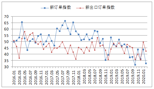 新冠肺炎疫情擴散后,鋼材市場需求趨于收縮,加上各地延遲開工復工,進一步導致供應鏈下游企業需求回升放緩,國外需求也明顯減少。新訂單指數為32.7%,較上月下降11.1個百分點;新出口訂單指數為42.5%,較上月下降7.2個百分點,連續18個月運行在50%以下。