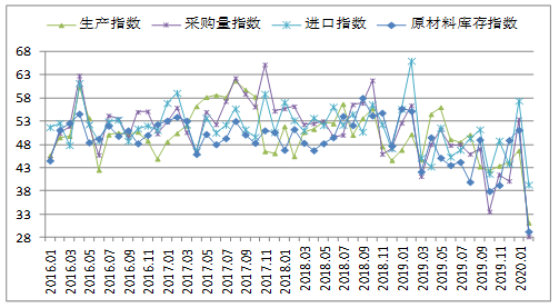 圖4 2016年以來生產指數、采購量指數、進口指數和原材料庫存指數變化情況
