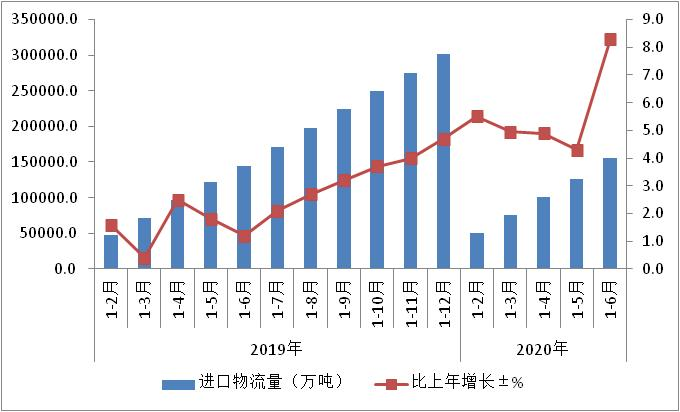 進口物流需求量顯著增長。上半年,國內疫情防控形勢向好,我國率先推動企業復工復產,支撐進口物流需求企穩回升,貨物貿易進口量增長8.3%,增速比1-5月份提高4個百分點。主要貨類中,大宗商品和重點農產品進口量均有所增加。進口鐵礦石增加9.6%;進口煤增加12.7%;進口大豆增加17.9%;進口牛肉增加42.9%;進口豬肉增長1.4倍。