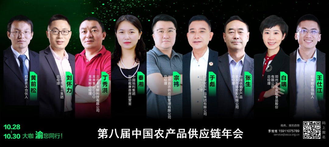 11:00-12:30 | 【圓桌對話】順勢聚力,時代機遇下農產品供應鏈發展新趨勢 主持嘉賓:秦玉鳴,中國物流與采購聯合會農產品供應鏈分會秘書長 對話嘉賓: 楊芳,新希望集團有限公司領導小組成員、浙江前程投資股份有限公司董事長 白瑞,鄭州千味央廚食品股份有限公司總經理 張生,中國供銷農產品批發市場控股有限公司總經理 于彪,望家歡農產品集團有限公司董事總經理 張奕,叮咚買菜副總裁 劉懷力,蘇寧零售云集團總經理 常希光,北京市裕農優質農產品種植有限公司總經理 |