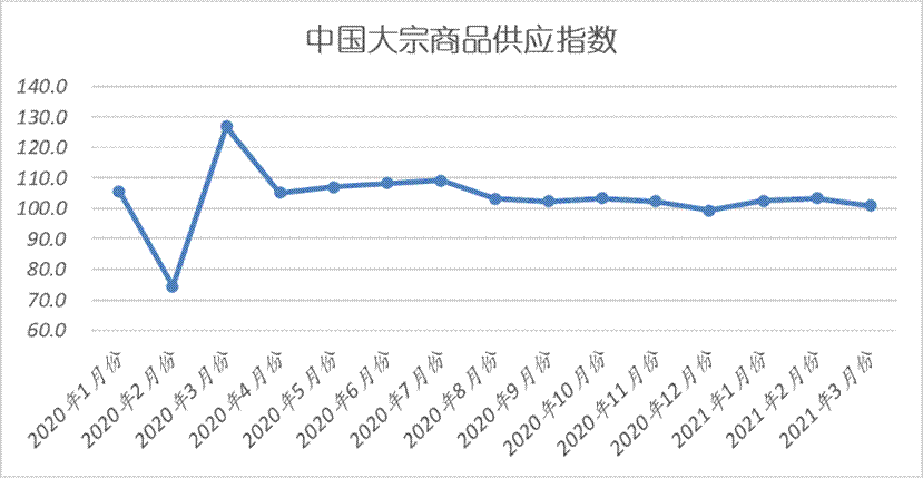 2021年3月份,大宗商品供應(yīng)指數(shù)較上月回落2.4個(gè)百分點(diǎn),至101.0%,顯示隨著各地環(huán)保限產(chǎn)政策從嚴(yán),特別是“碳中和”正在引領(lǐng)部分行業(yè)第二次供給側(cè)改革,導(dǎo)致部分商品生產(chǎn)受阻,產(chǎn)量減少,當(dāng)前商品供應(yīng)增速回落。不過(guò),由于商品價(jià)格較為堅(jiān)挺,企業(yè)生產(chǎn)利潤(rùn)尚可,生產(chǎn)熱情仍較為高漲,所以商品供應(yīng)僅是增速回落,整體供應(yīng)量未見(jiàn)下降。從各主要商品來(lái)看,本月各商品供應(yīng)量變化情況出現(xiàn)分化,鋼鐵、原煤、成品油等商品受環(huán)保限產(chǎn)、企業(yè)檢修等因素影響,供應(yīng)量開(kāi)始明顯減少,有色金屬和化工供應(yīng)量則出現(xiàn)增速回落,不過(guò)鐵礦石和汽車供應(yīng)量受到港量增加以及季節(jié)性等因素影響,有所增加。