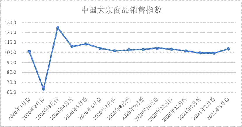 2021年3月份,大宗商品銷售量指數(shù)止跌反彈至103.6%,為近五個(gè)月以內(nèi)的最高點(diǎn),顯示隨著天氣逐漸回升,國(guó)內(nèi)基建投資力度放大,市場(chǎng)終端需求開(kāi)始集中釋放,商品成交量明顯增加。各主要商品中,鋼鐵、煤炭、成品油和汽車銷售量止跌反彈,且升幅明顯,有色金屬和化工銷售量繼續(xù)增長(zhǎng),且增速均有所加快,鐵礦石銷售量受鋼廠限產(chǎn)影響,增速有所減緩。
