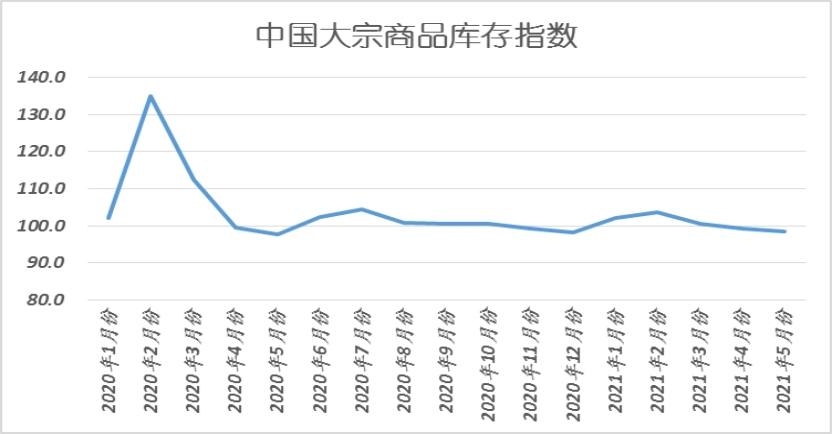 2021年5月份,大宗商品庫存指數連續三個月下降,本月跌至98.4%,較上月下降0.7個百分點。顯示當前市場供需較為均衡,商品“去庫存化”得到延續,商品庫存壓力持續緩解。各主要商品中,鋼鐵、鐵礦石、煤炭、成品油、有色金屬和化工庫存量均較上月有所減少;汽車庫存量雖有所增加,但增速出現減緩。