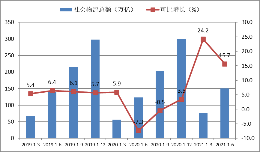 2020年新冠疫情對宏觀經濟和物流運行造成重大沖擊,黨中央、國務院審時度勢開展疫情防控,多措并舉恢復生產生活,2021年上半年物流運行沿著穩步復蘇軌跡行進,主要總量指標高于疫情之前水平。社會物流總需求趨穩,上半年社會物流總額150.9萬億元,可比增長15.7%,其中工業和居民消費物流需求壓艙石作用繼續鞏固,進口物流實物量保持增勢,物流市場規模繼續擴大。