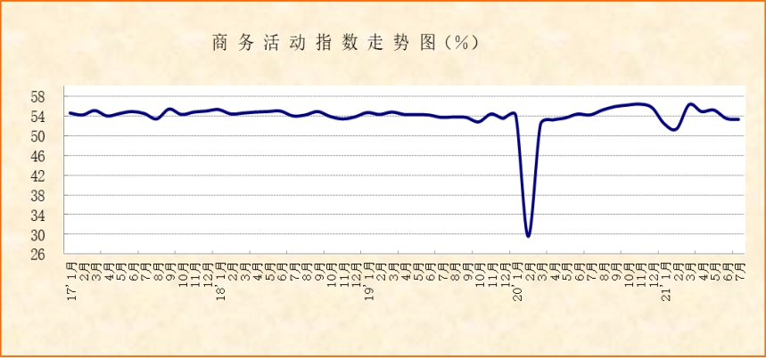 中國物流與采購聯合會、國家統計局服務業調查中心發布的2021年7月份中國非制造業商務活動指數較上月小幅下降0.2個百分點至53.3%,連續2個月保持在53%以上;新訂單指數較上月小幅回升0.1個百分點至49.7%。指數變化顯示,市場供需呈現緩中趨穩的走勢。受供需變化影響,就業活動和市場銷售價格均有所趨穩。從業人員指數較上月小幅回升0.2個百分點至48.2%,連續2個月穩定在48%左右;銷售價格指數較上月小幅回落0.1個百分點至51.3%,連續2個月穩定在51%左右。綜合來看,非制造業增速繼上月明顯回落后,本月走勢基本穩定,整體呈現緩中趨穩走勢。建筑業淡季回調是本月非制造業增速稍有放緩的主要影響因素。服務業充分發揮了經濟穩定器作用,為非制造業緩中趨穩提供支撐。