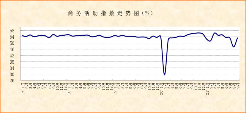 中國物流與采購聯合會、國家統計局服務業調查中心發布的2021年9月份中國非制造業商務活動指數較上月回升5.7個百分點至53.2%;新訂單指數較上月回升6.8個百分點至49.0%,伴隨著疫情影響的減弱,非制造業供需活動較上月有明顯恢復,但與去年同期相比,上述兩個指數均有不同程度回落,顯示非制造業恢復力度仍有待加強。供需的明顯恢復帶動終端銷售價格和就業活動有所回穩。銷售價格指數較上月回升1.2個百分點至50.5%;從業人員指數較上月回升0.8個百分點至47.8%。