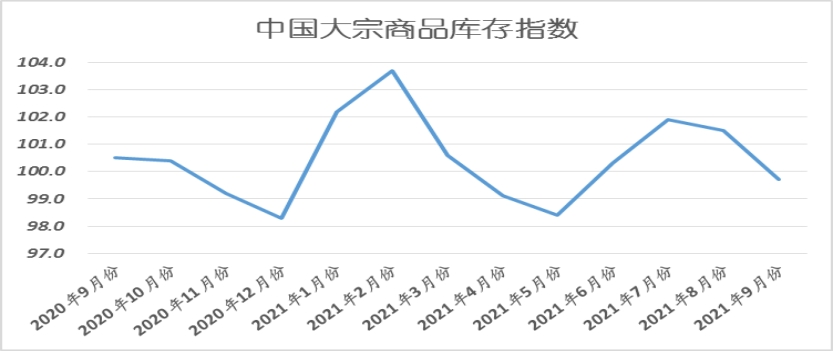 2021年9月份,大宗商品庫存指數較上月回落1.8%,跌至近四個月以來的最低,商品庫存量時隔三個月后再現下降格局,表明隨著供給端持續下降,消費端旺季回暖,市場供需銜接順暢,供求關系有所改善,商品庫存開始減少,市場庫存壓力有所緩解。各主要商品中,鋼鐵、原煤、有色金屬和汽車庫存量均較上月有所減少,鐵礦石、成品油和化工庫存量雖有增加,但增速較上月均有減緩。