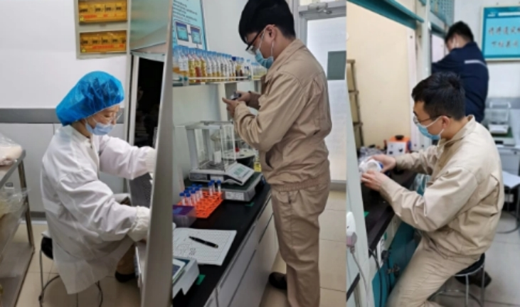 “新·星未來”大學生董永臣、李宏宇和新員工董志鵬、孫海萌面對不斷送來的樣品,仔細檢測,并第一時間告知生產車間檢測結果,保證了車間生產進度。孫博雯也是“新·星未來”大學生的一員,在此次疫情期間檢測輔料包材工作的同時,還肩負微生物檢測工作。胡靜軒更是身負重任,在人員不足的條件下,合理安排時間,完成了各種原料油、精煉油、成品的各項質量指標檢測,保障了原料使用和產品出廠。