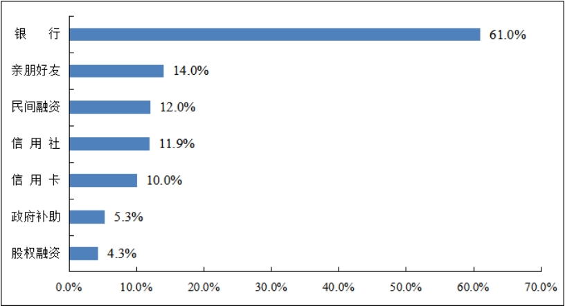 被調查企業融資渠道較為單一。調查數據顯示,61%的企業主要通過銀行來獲取資金,11.9%的通過信用社獲取資金;通過親朋好友借貸、民間融資以及信用卡等方式獲取資金的合計占三分之一,通過股權融資方式獲取資金的占比僅為4.3%。