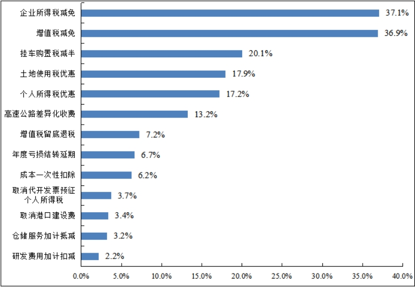 中小微物流企業亟需加大稅費支持力度。根據被調查企業反映已享受的稅費優惠政策來看,行業普惠性政策落實較好。享受企業所得稅減免、增值稅減免政策的占比較多,分別占到37.1%和36.9%,享受掛車購置稅減半政策的企業占20.1%,還有個人所得稅優惠占比也較多。