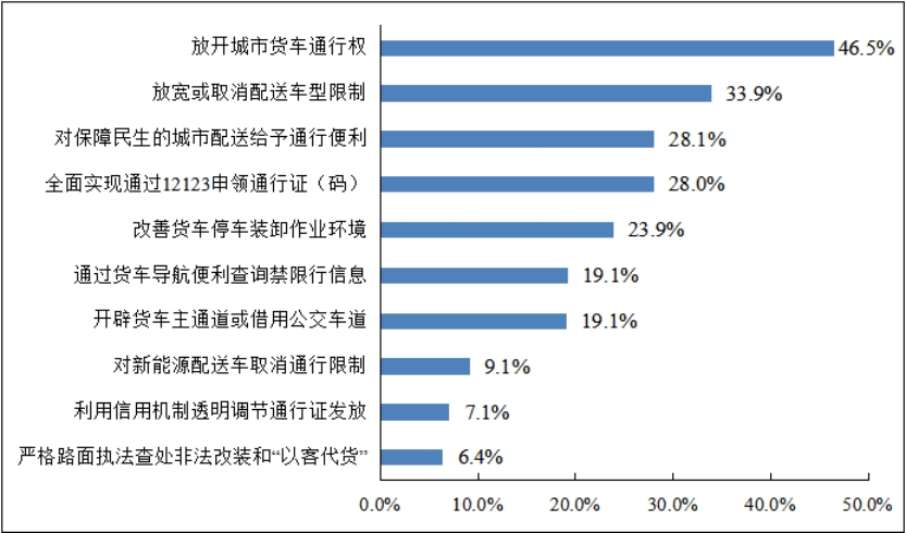 排名第三的是對保障民生的城市配送給予通行便利。這也是《指導意見》提出的,對于冷藏運輸車、搬家配送車、快遞郵政車等保障民生的城市配送車輛放寬通行限制。為保障貨車通行,部分企業希望開辟貨車主通道或借用公交車道,以避免公共資源浪費。
