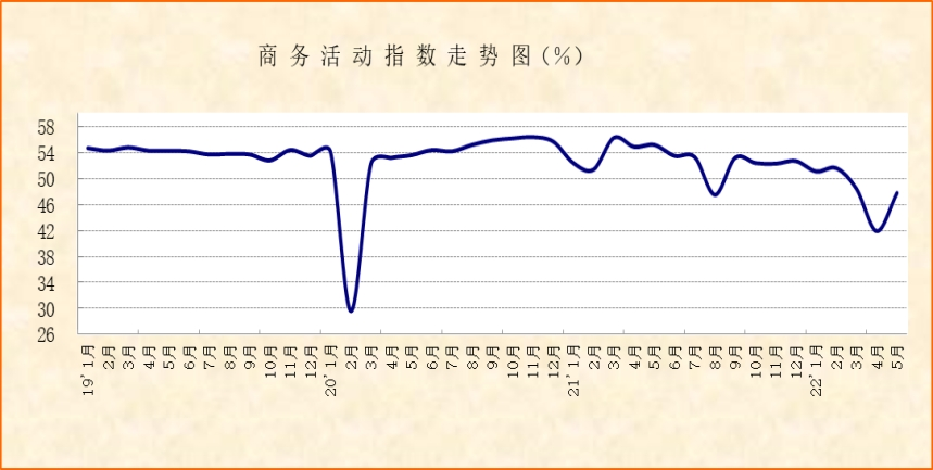 中國物流與采購聯合會、國家統計局服務業調查中心發布的2022年5月份中國非制造業商務活動指數較上月上升5.9個百分點至47.8%;新訂單指數較上月上升6.7個百分點至44.1%。綜合指數變化,隨著疫情防控形勢逐步好轉和相關扶持政策的持續推動,5月份非制造業供需活動較上月有所恢復,但指數水平均低于50%,且低于2021年同期,非制造業恢復力度仍有待加強。