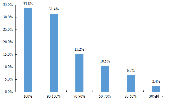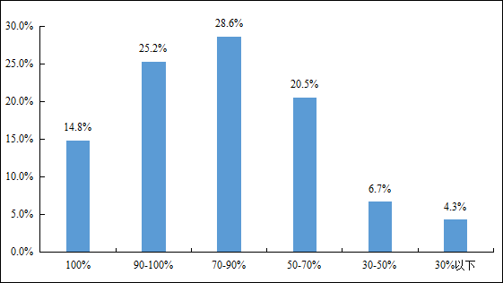 企業員工到崗情況保持在較高水平。調查數據顯示,超過三分之一(33.8%)的企業員工全部到崗;接近三分之一(31.4%)的企業到崗率在90%-100%之間。調研顯示,員工到崗率低的地區主要是重點疫情地區。隨著各地疫情逐步趨向好轉,員工到崗率穩步復蘇,有力支撐復工達產和經濟復蘇。