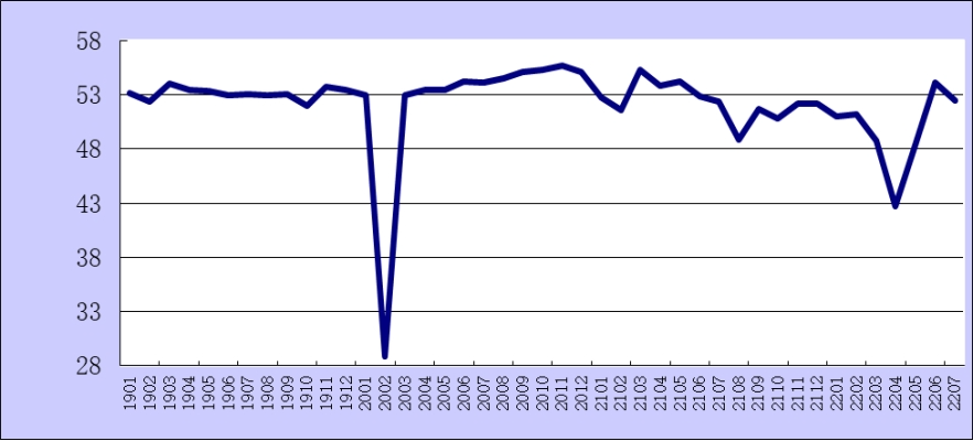 其中,2022年7月份,制造業生產指數為49.8%,比上月下降3個百分點;非制造業商務活動指數為53.8%,比上月下降0.9個百分點。