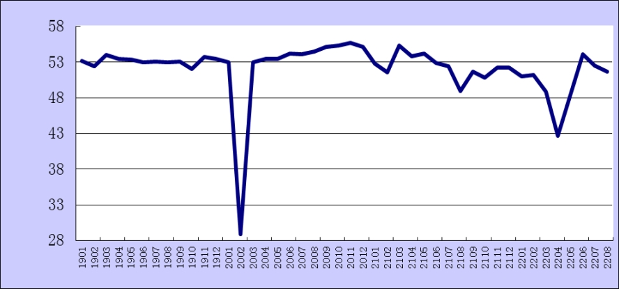 2019年1月-2022年8月綜合PMI產出指數走勢圖