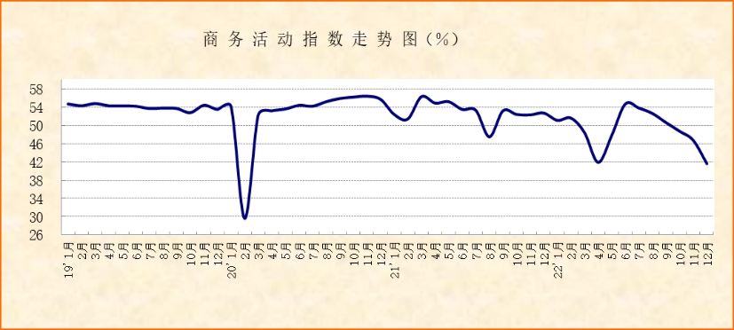 中國物流與采購聯合會、國家統計局服務業調查中心發布的2022年12月份中國非制造業商務活動指數為41.6%,較上月下降5.1個百分點,連續6個月環比下降,連續3個月運行在50%以下;新訂單指數為39.1%,較上月下降3.2個百分點,連續4個月環比下降,連續6個月運行在50%以下。綜合指數變化,12月,非制造業供需呈現繼續下探走勢。四季度,在新冠病毒感染疫情影響下,非制造業整體走勢要弱于前三季度。2022年四季度,非制造業商務活動指數均值為45.7%,較一季度、二季度和三季度均值分別下降4.7和2.4和6.6個百分點。